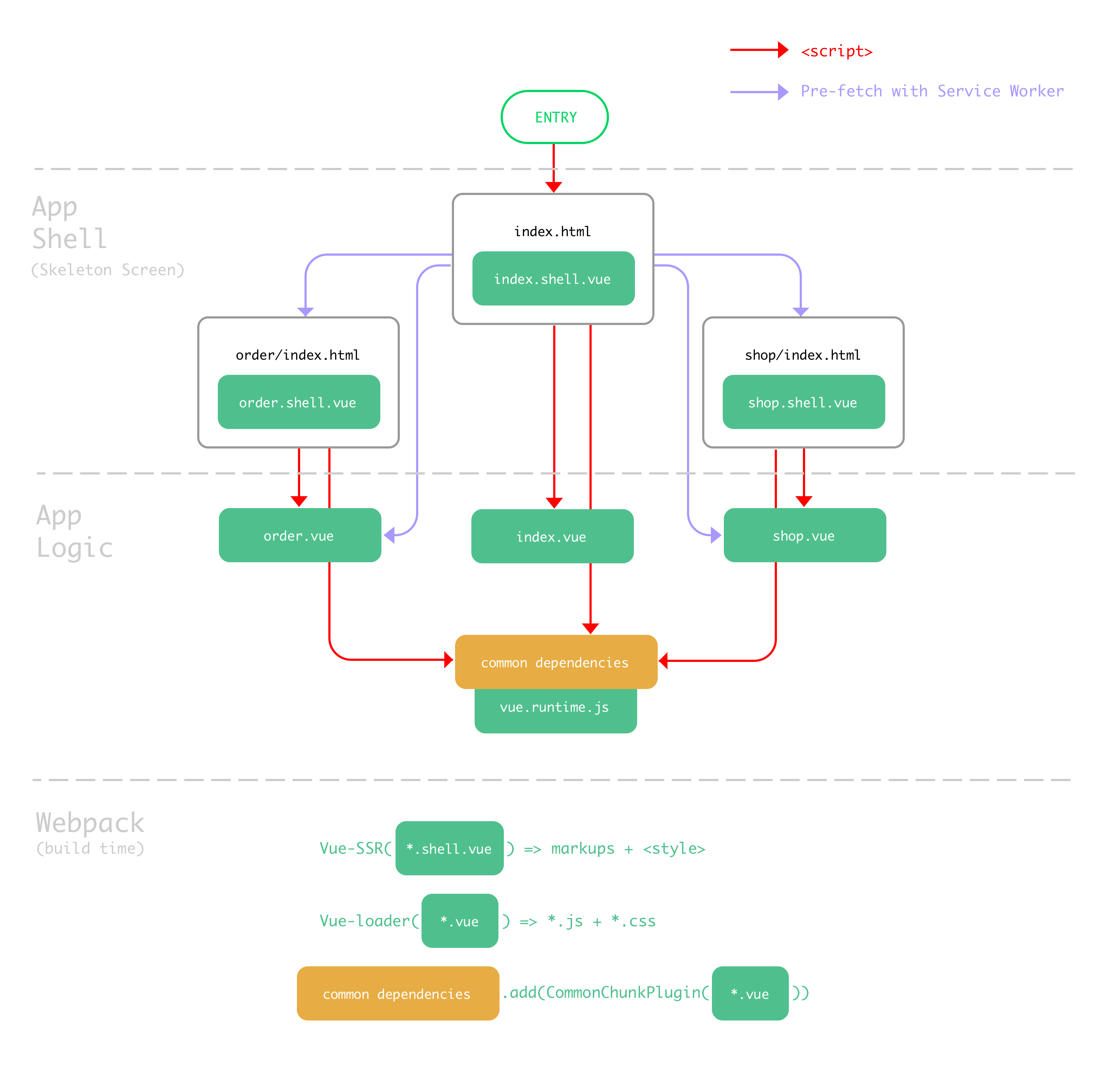最后附上一张图,这张图当时是做给 Addy Osmani 的 I/O 演讲用的,描述了饿了么 PWA 是如何结合 Vue 来实现多页应用的 PRPL 模式,可以作为一个架构的参考与示意图。